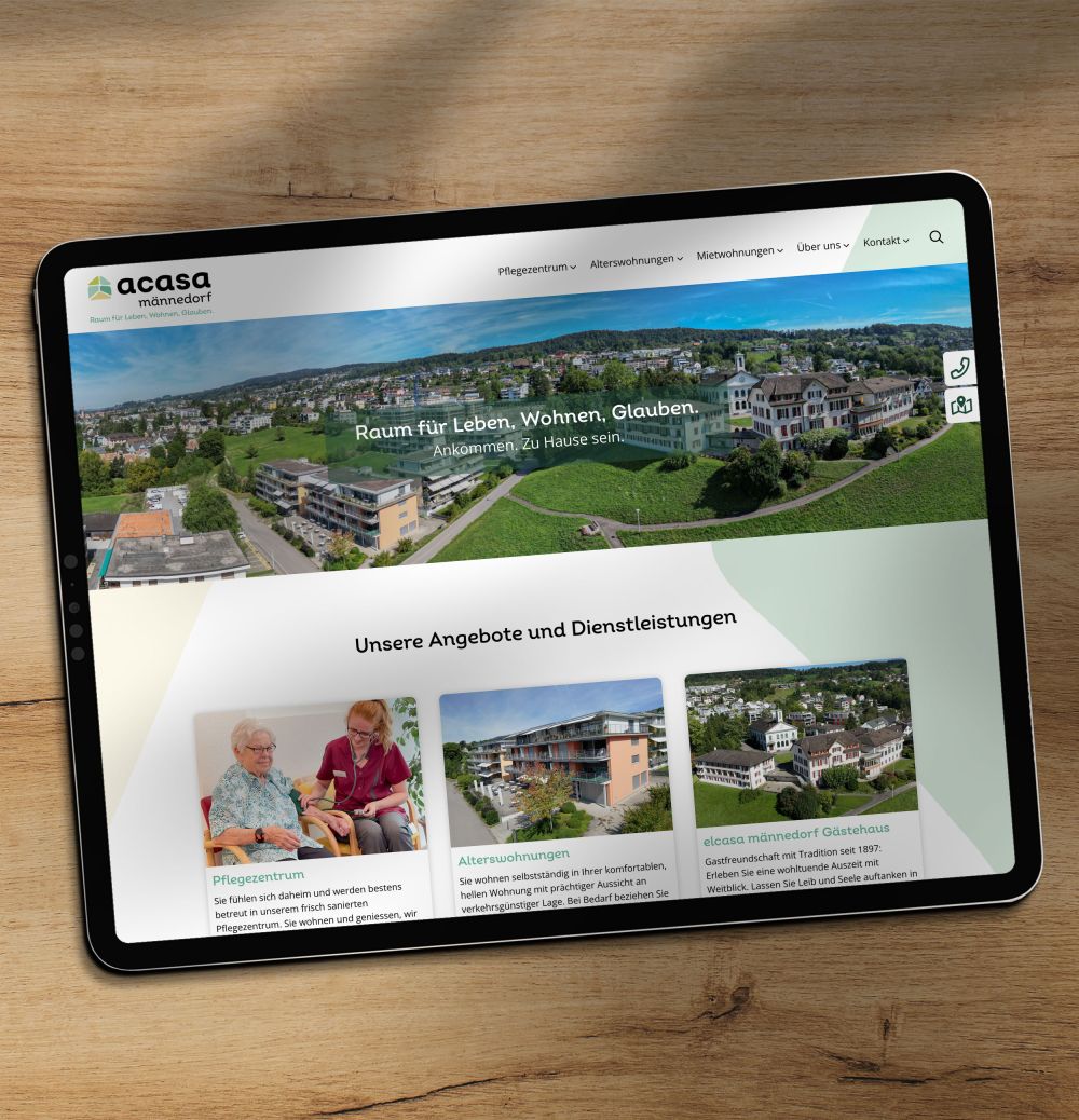Besonders umfassend war die neue Website: Gestaltung, Programmierung und Inhalte wurden von uns konzipiert und umgesetzt, während die Kundin acasa männedorf zahlreiche Texte lieferte. PS Werbung verwob sämtliche Elemente zu einem stimmigen Gesamtauftritt. Der neue Auftritt wurde im Rahmen eines Festakts feierlich enthüllt – für Mitarbeitende, Bewohner, Geschäftspartner und Freunde gleichermassen eine gelungene Überraschung.