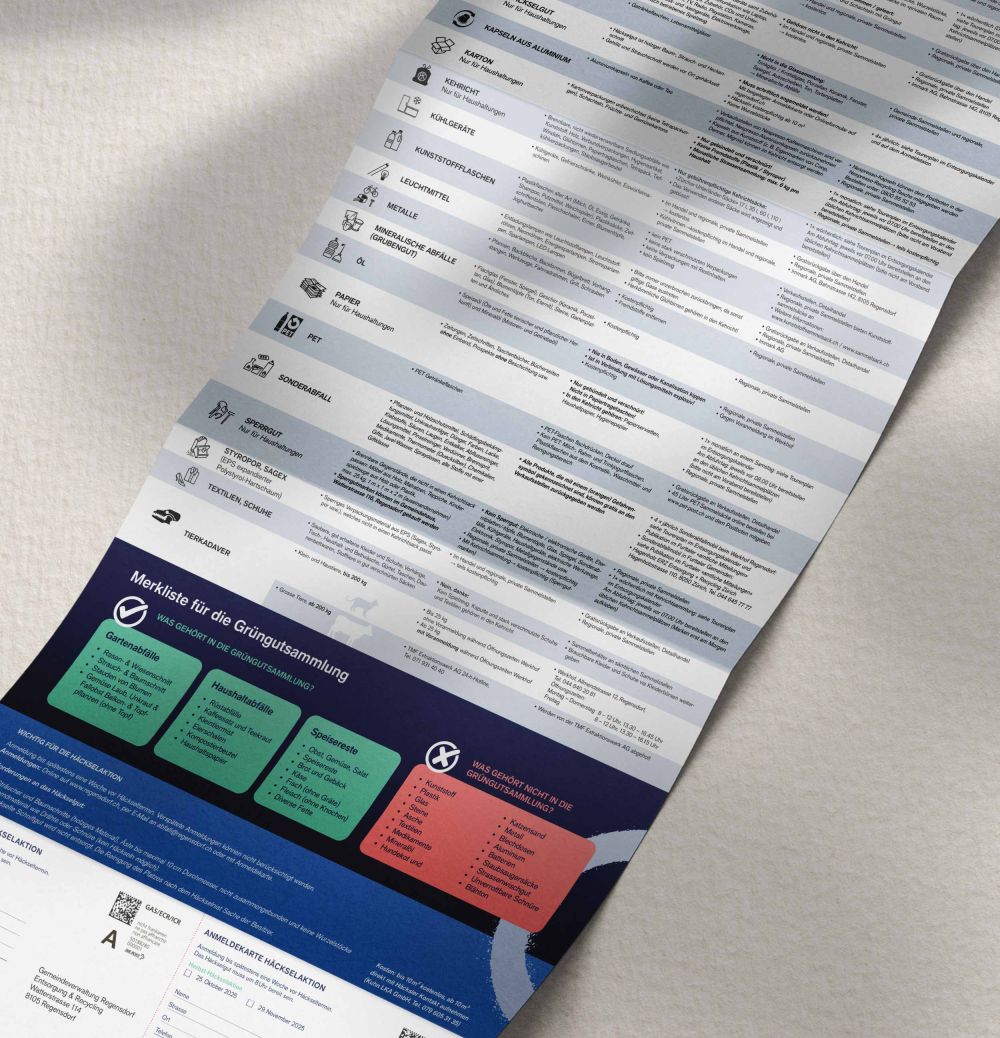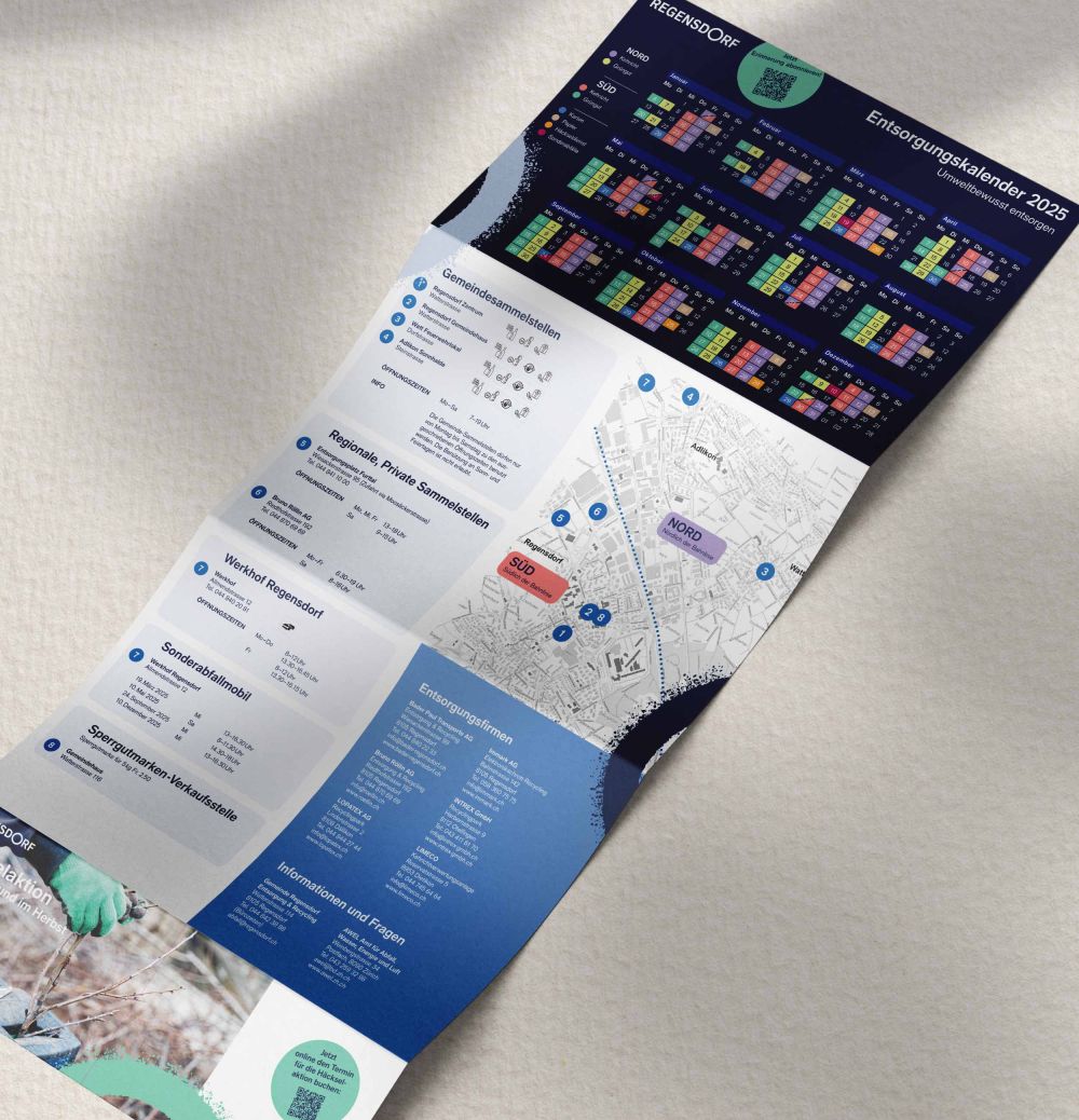Regensdorf hat ein ehrgeiziges Ziel: Die Gemeinde möchte sich zu einer der modernsten im Kanton Zürich entwickeln. Passend zur Neuausrichtung hat PS Werbung den Entsorgungs- und Abfallkalender gestaltet. Das klar strukturierte Layout verschafft Nutzerinnen und Nutzern auf Anhieb Überblick über alle Sammeltermine. Der Kalender informiert über die Sammelstellen, über Entsorgungsfirmen und das richtige Vorgehen beim Recycling unterschiedlicher Wertstoffe. Das macht ihn zum praktischen und unverzichtbaren Begleiter des Alltags aller Regensdorferinnen und Regensdorfer.