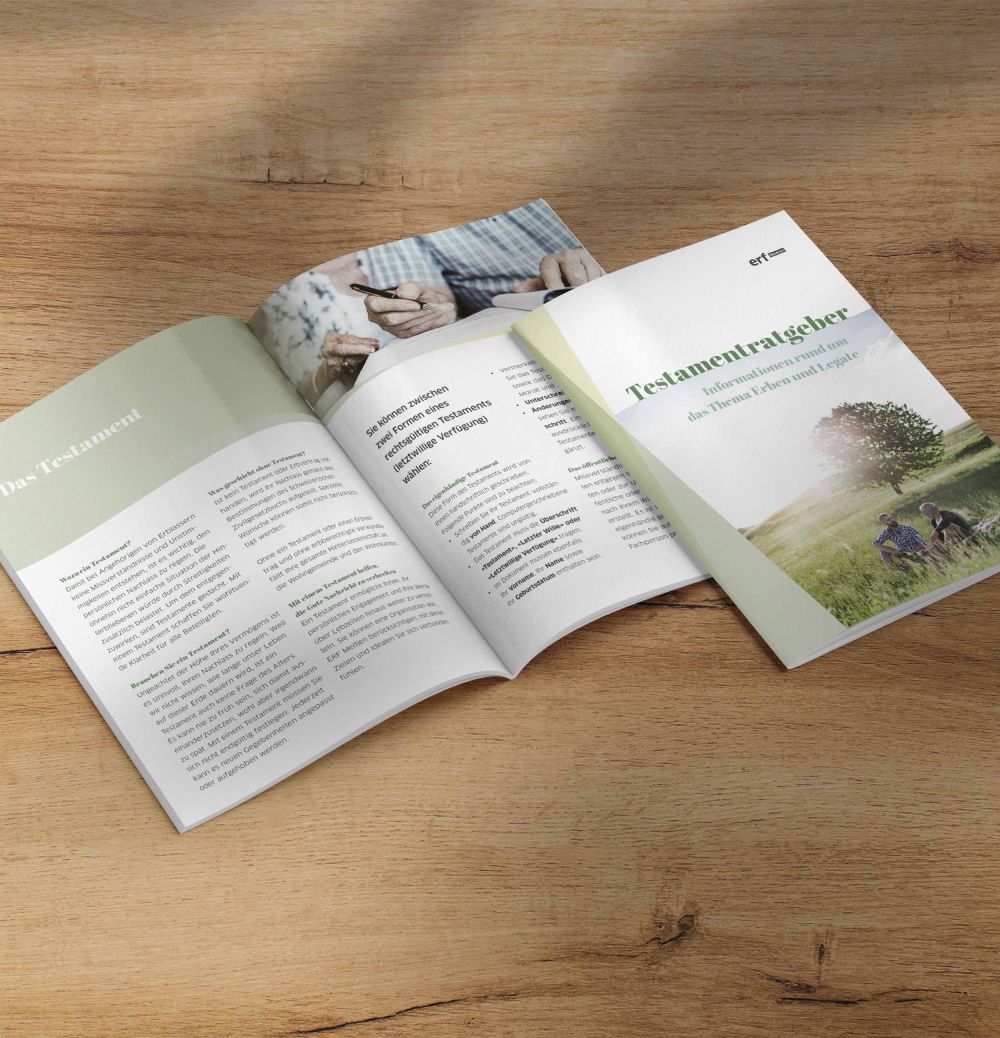 ERF Medien ist ein christlich geprägtes Non-Profit-Unternehmen. PS Werbung hat für die Organisation einen wertvollen Testament-Ratgeber konzipiert. Die Broschüre bildet ein zentrales Element der Kommunikation für Fundraising und Spenderbindung. Sie informiert Interessierte über die Möglichkeiten, die Medienarbeit von ERF Medien auf eine ganz besondere Weise zu unterstützen.