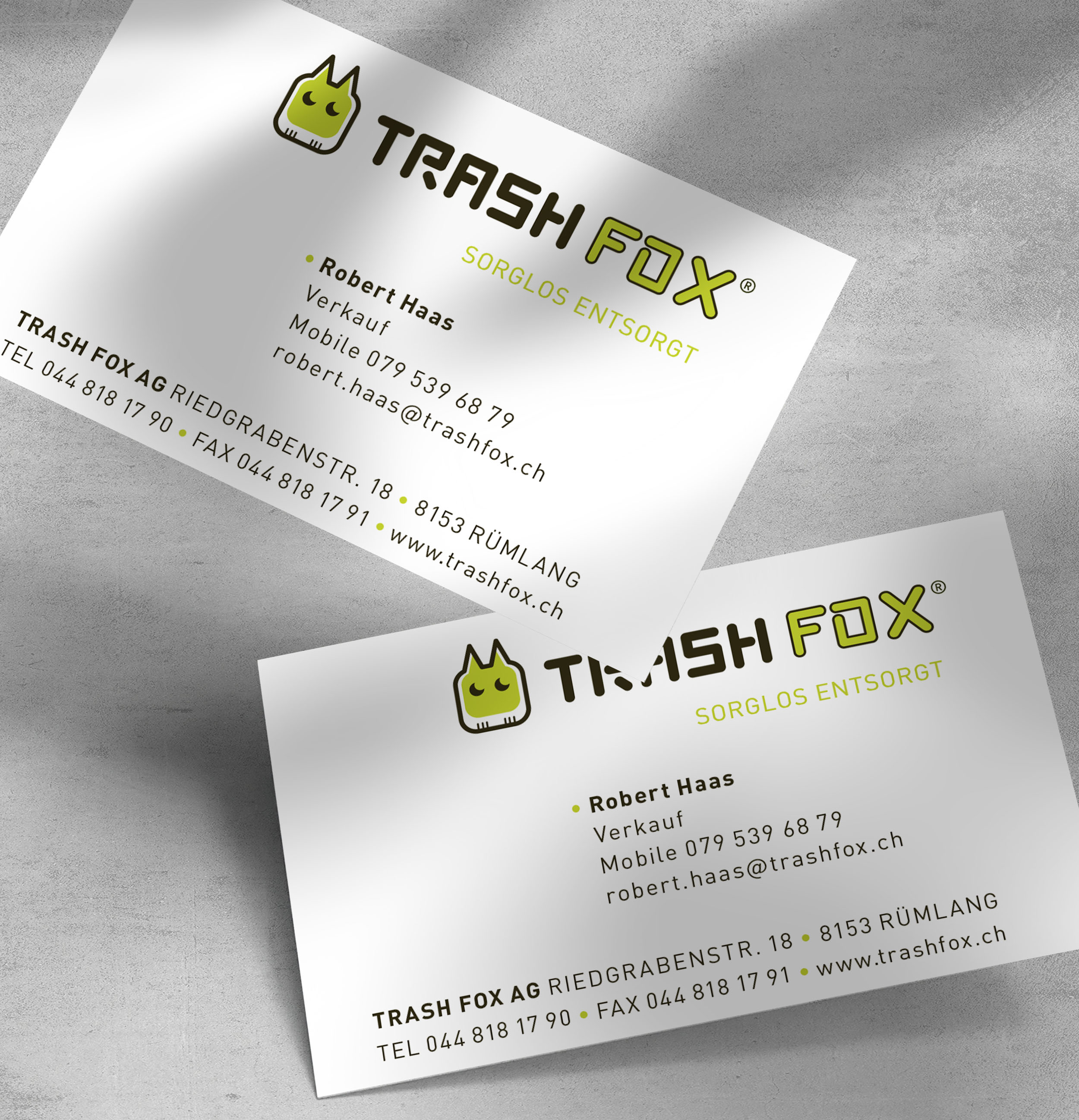 Trashfox AG entwickelt Abfallsammelsysteme – «unterirdisch gut», wie das von PS Werbung entwickelte Motto lautet. Für die Marke kreierten wir ein einprägsames Logo mit stilisiertem Fuchskopf. Die Umsetzung auf einer breiten Palette von Drucksachen und die Beschriftungen der Abfallbehälter verleihen dem Produkt seine unverwechselbare Identität. Eine Identität, die sich im Alltagseinsatz bestens bewährt.
